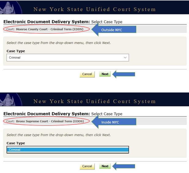 Go to the Electronic Document Delivery System webpage and click on the Supreme Court – Criminal Term link to for superior criminal courts inside the 5 boroughs of New York City (i.e., Bronx, Kings, New York, Queens and Richmond Counties) or click the County Court – Criminal Term link for superior criminal courts outside New York City.