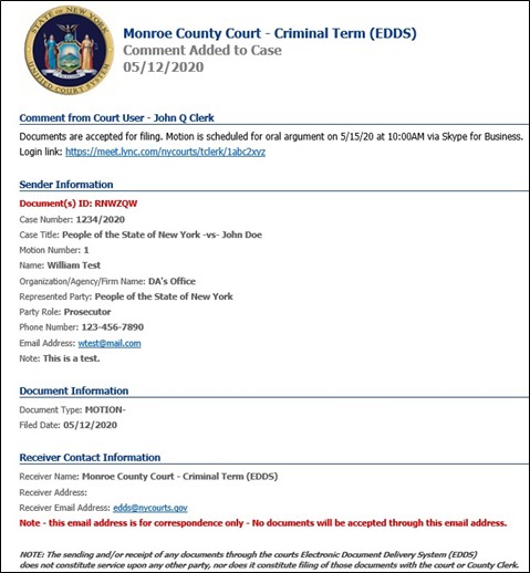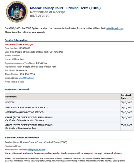 Document submission via EDDS does not constitute service of the document upon any other party. If service is required, you must serve by some other electronic means, including email or facsimile, and upload a Proof of Service document (i.e., Affidavit, Affirmation or Acknowledgement) with your submission.