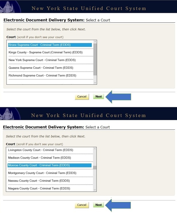 Criminal case types and document types authorized for EDDS submission may vary from week to week and from one court or judicial district to the next. If you are unsure whether your documents are authorized for submission via EDDS, contact the applicable Court or Judicial District Office to confirm before submitting. To find court contact information, use the Court Locator on the Unified Court System's public webpage, choose the county and court type from the drop-down menus, and then click the Find the Court button.