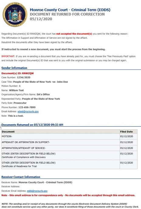 If your documents are returned for correction by the court, you will receive a second email, which will include important information about your submission and directions regarding how to proceed with your case [see example below]. If you do not receive a second email from the court, you may contact the court using the email address found in the email confirming receipt of your submission [read Step 9: Automated Receipt Confirmation Email], but do not use this email address to send documents to the court. It is for correspondence purposes only.