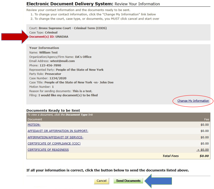 Review the information you entered. Click the Change My Information link to correct your contact information. Click the Cancel button and start over to change any other information. Click the Send Documents button to finish the submission.