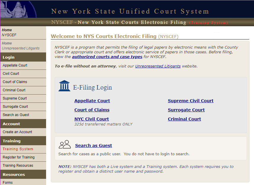 NYSCEF also makes available the "Training System." The Training System mimics the Live System in function and appearance, but no real