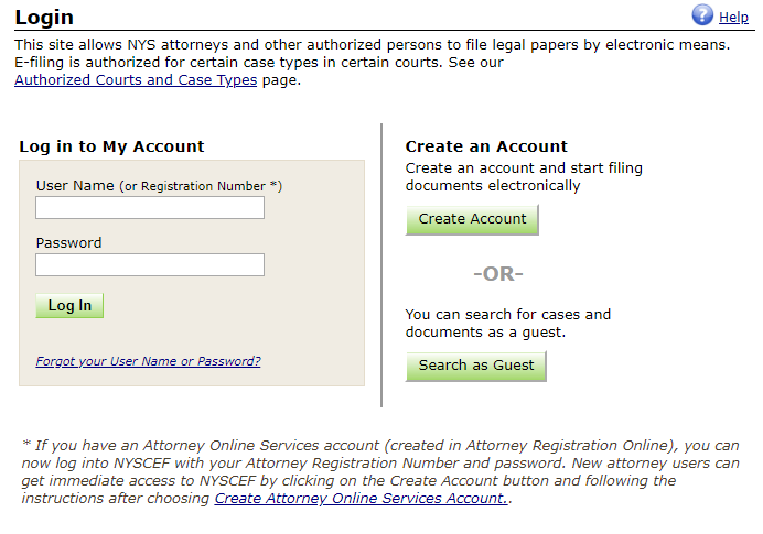 established Attorney Online Service (AOS) accounts with Attorney Registration may log into NYSCEF using their Attorney Registration