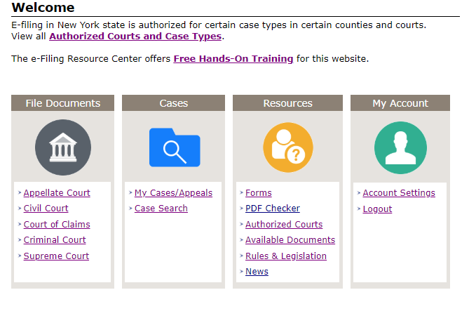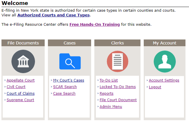 Once you have logged in, you will be given a menu of options for filing documents, searching cases, resources, and account settings.