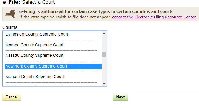 After selecting the type of court, you will be able to choose from a list of county courts or district courts. (Though the NYSCEF homepage displays separate links for all five courts, they all share the same NYSCEF screens.)