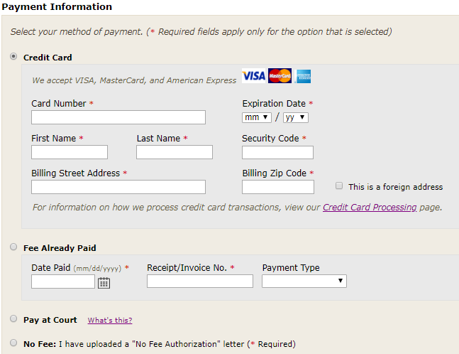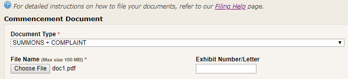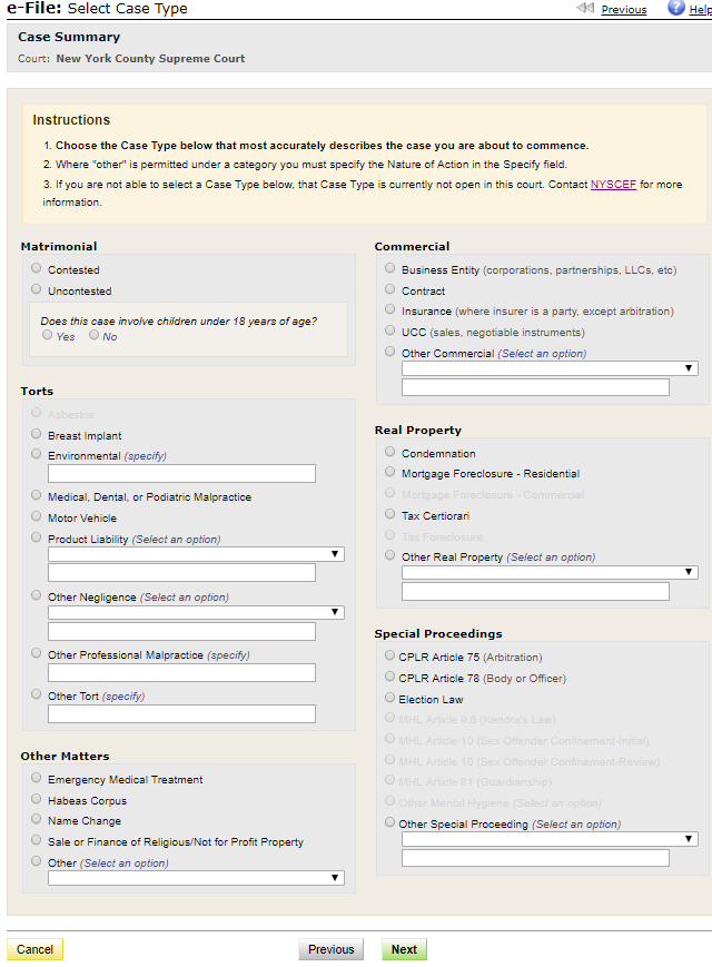 Different types of cases can be electronically filed in different courts. When you select your court, the case types that can be electronically filed in that court will appear on the Select a Case Type screen. When you have completed the form, click "Next".