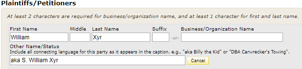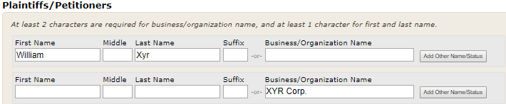 To enter your plaintiffs or petitioners, type the name of the first plaintiff or petitioner that appears on your commencement document. If that party is an individual, complete the fields provided for first, middle, last name, and suffix. If a party is a business or organization, complete the field provided for Business/Organization name. The screen allows you to enter up to five plaintiffs/petitioners. If your case has more than five, click the Add More Plaintiffs/Petitioners button at the bottom of that box.