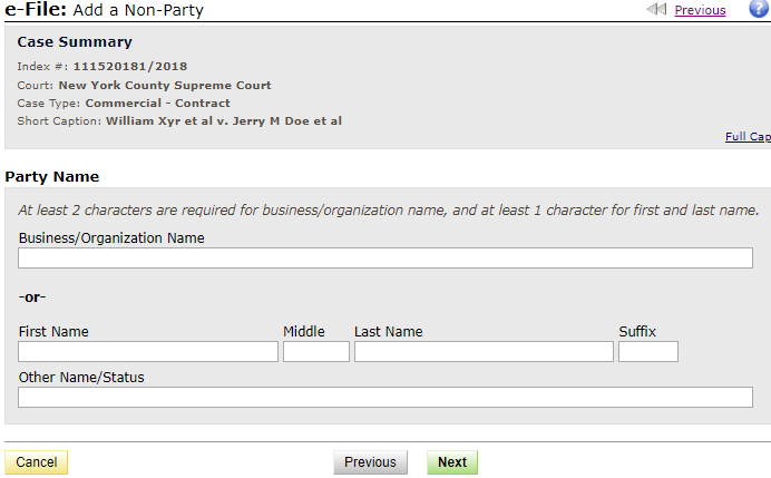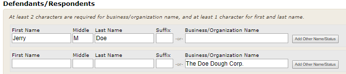 Note: In order to move forward with the filing, a defendant/respondent must be entered even if no such party exists in the actual case. If commencing a non-adversarial case, enter "N/A" in the Business/Organization field. -