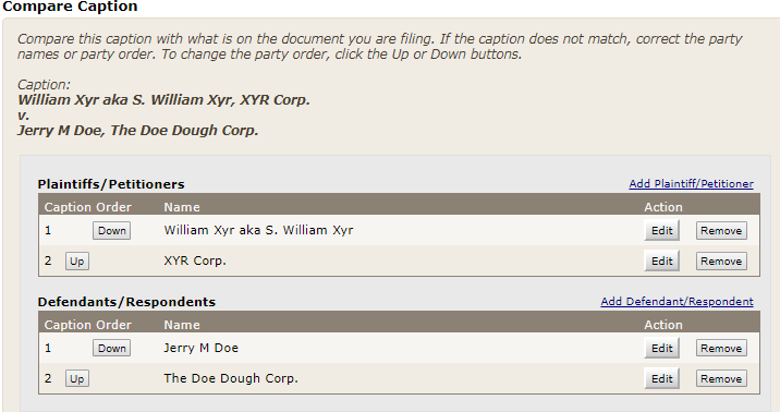 Review each party in the caption to be sure that the caption you have entered matches the caption on your commencement document. The Compare Caption box, shown below, provides four ways to edit your caption.