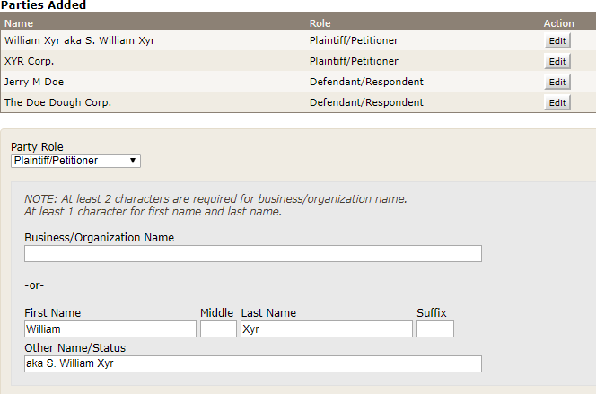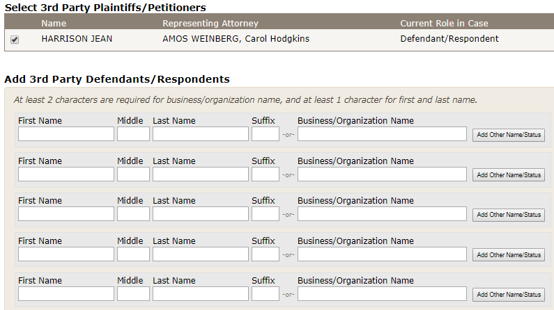 The "Add Plaintiff/Petitioner" and the "Add Defendant/Respondent" links allow you to add a party you may have forgotten to include. The Add Party screen that opens after clicking these links requires you to identify the party's role, supply the party's name, and, if necessary, enter the party's other name/status.