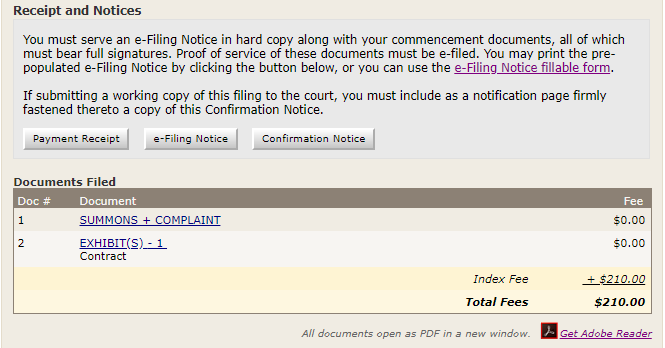 Also note that the Document Details tab provides an additional way to access the Confirmation Notice for a document. (See also the Document List discussion, above.) If you forget to print your Confirmation Notice when you first file your document and then need to print that Confirmation Notice to firmly affix to a working copy requested by the court, it can be accessed from this tab. -