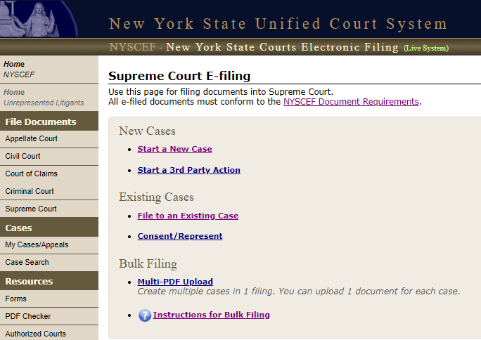 NYSCEF is not only a system through which documents can be filed. It is also a system through which e-filed documents can be searched and viewed at no cost. Not only can filers search documents filed in cases in which they are e-filing participants, the general public can also search all NYSCEF cases and view any document that has not been sealed, otherwise restricted, or marked secure prior to April 15, 2013 (see Section Starting a New Case (G)).