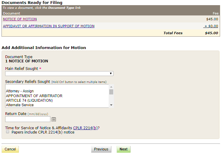 Additional help and resource links prominently display on the bottom of every screen in the application. From these links you can access NYSCEF forms, review the rules governing e-filing and so much more. -