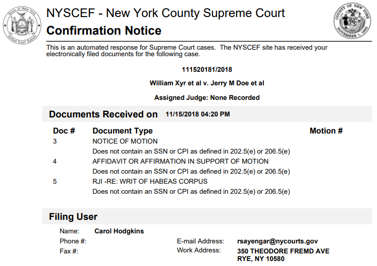 who has submitted the filing as well as to the primary e-mail (and cc) addresses of all other NYSCEF users who have consented in the