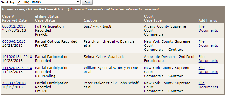 A listing of all the cases in which you are a participant will appear. You may narrow your results by selecting a particular court, case type, or case status from the drop down menus. You may also sort the results by one of the following criteria:- Claim or Index Number