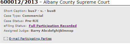 Note that in the bottom left hand corner of the Case Summary box there is an "Email Participating Parties" link. This feature allows you to send an e-mail to all parties in the case who are participating in e-filing. This feature is provided as a courtesy and you do not need to use this link to serve documents in this action. However, if you wish to contact the participating parties for any reason, you can utilize this link. Please note that NYSCEF does not retain any e-mail sent using this link. -