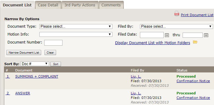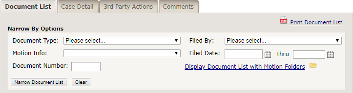 of documents filed in the case you are viewing. The box above the list of documents provides various "narrow by" options, including