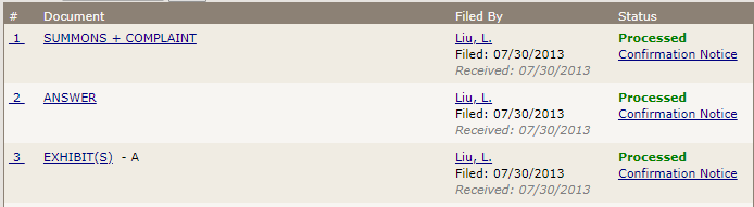 The document list shows the document number, document type, the status of the document, the received date, and the filing user. To view an image of any document appearing on the list, simply click on the document name, such as "SUMMONS + COMPLAINT", and an image of the document will open. However, if the document has been returned for correction, you will not be able to view an image of the document. In addition, links in the far right column allow you to access the Confirmation Notice generated by NYSCEF upon the filing of that document and, if the document was a fee document, the receipt generated by NYSCEF upon the payment of that fee. -