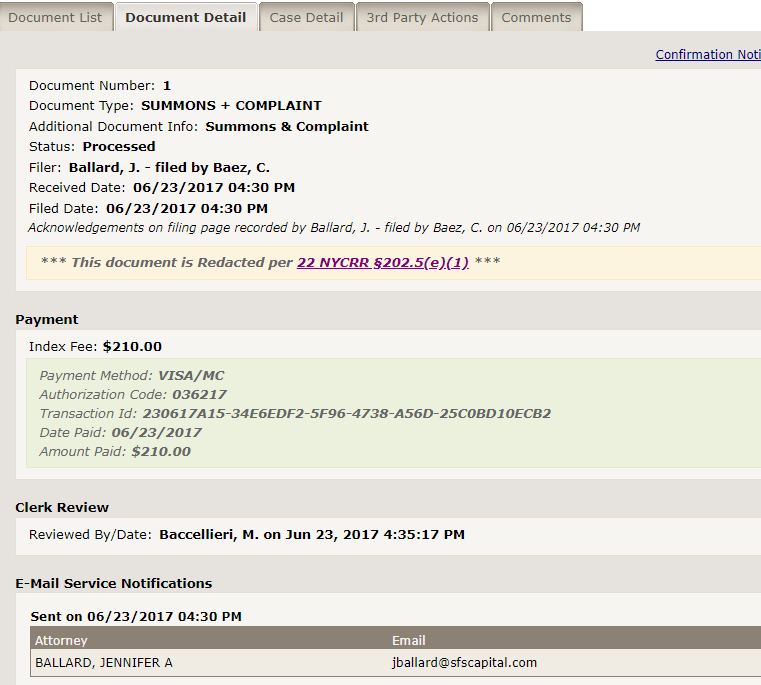 These details include, in the box at the top, filing information about the document; security information, e.g., whether the document is sealed or contains a social security number); payment information (e.g., the amount of the fee and the manner of payment); the results of any court review of the document; and the recipients of e-mail notifications. If the case includes parties who are not participating in e-filing, that fact will be noted with the reminder that any non-participating parties must be served in hard copy.