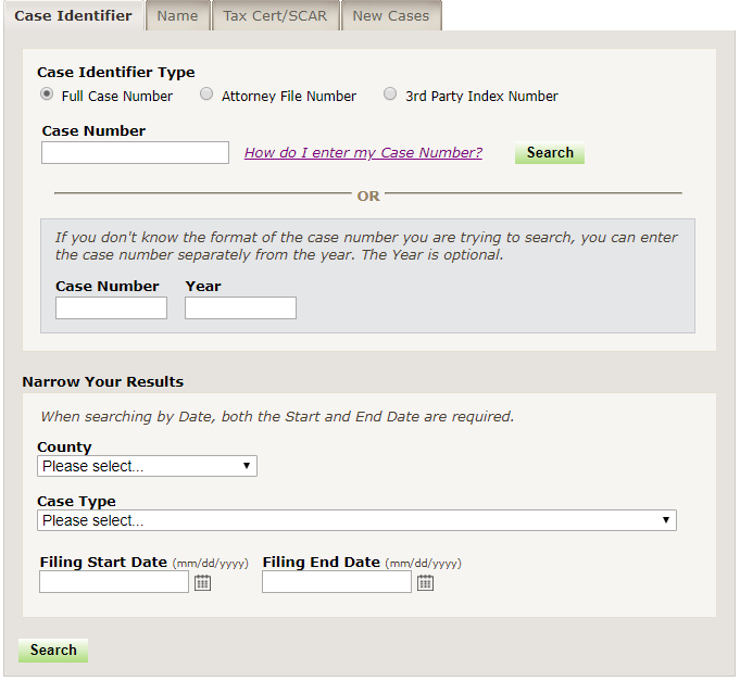 Show Narrow By Options button before clicking the Search button. These narrow by options include county, case type, and filing date range.