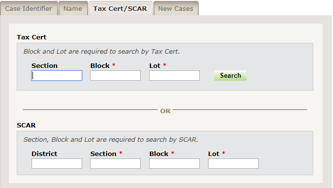 or Tax Cert/SCAR matters (by block and lot):